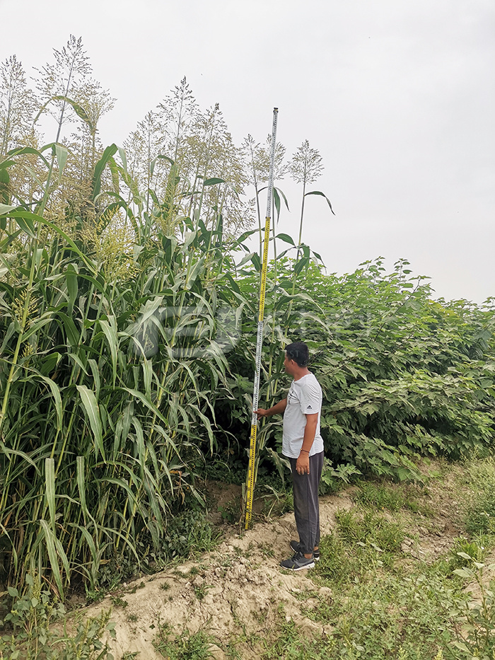 “驚喜”前期發(fā)苗快,根系發(fā)達(dá),莖稈柔韌,耐密植,株高可達(dá)3.5-4.5m??啥啻呜赘?,刈割再生速度快,一個生長季可刈割2-3茬,水肥條件合適,鮮草畝產(chǎn)量10噸以上。