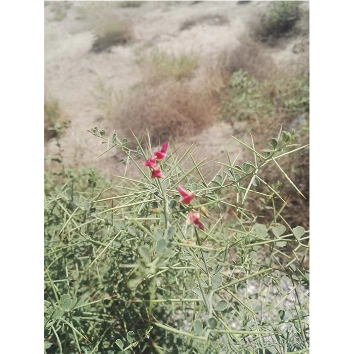 駱駝刺(Alhagi camelorum Fisch.)是豆科駱駝刺屬半灌木草本植物。 株高30-60厘米,它的莖直立,有細(xì)條紋,無(wú)毛或幼莖有短柔毛,從基部分枝,灰綠色,具針刺;單葉互生,外形為卵形、卵圓形或矩圓形,先端鈍,全緣;總狀花序腋生,先端針刺狀,無(wú)毛,花長(zhǎng)在刺上,花萼鐘狀,具五齒;被短柔毛,萼齒三角狀或鉆狀三角形,花冠深紫紅色,旗瓣倒長(zhǎng)卵形,頂端鈍圓或截平,基部楔形,具短瓣柄,翼瓣長(zhǎng)圓形;果線形,彎曲形狀。種子1-6個(gè),腎形;駱駝刺花期為6-7月,果期為8-10月。因其是戈壁灘和沙漠中駱駝**能吃的草料而得名。
