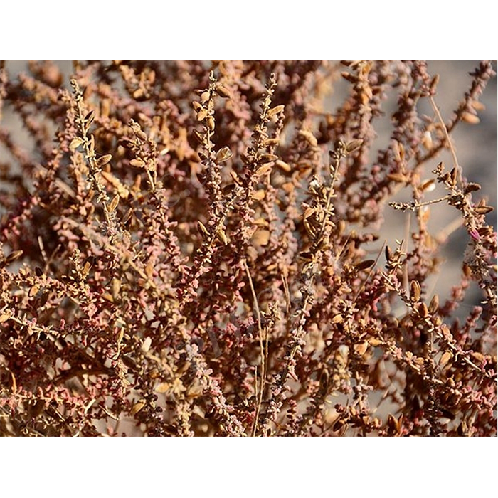 紅砂(Reaumuria songonica (PalL.)Maxim.),檉柳科紅砂屬小灌木。高15-25厘米。老枝灰棕由 葉肉質(zhì),短圓柱形,長部稍粗,長0.5-5毫米,寬1毫米,頂端圓鈍,常4-6枚簇生。5-6月開花,花單生葉腋或為少花的穗狀花序,無梗,直徑4毫米;萼鐘形,質(zhì)厚,5裂,下半部合生;花瓣5張開,白色略帶淡紅,長圓形,長3-4.5毫米,近中部有2個倒披針形附屬物。蒴果紡錘形。長5-6毫米,三瓣裂。種子數(shù)目較少(3-5個),種子大型,末端漸尖,頂端鈍圓而不具芒柱,種子表面密布褐色柔毛,花期6-8月,果期7-9月。