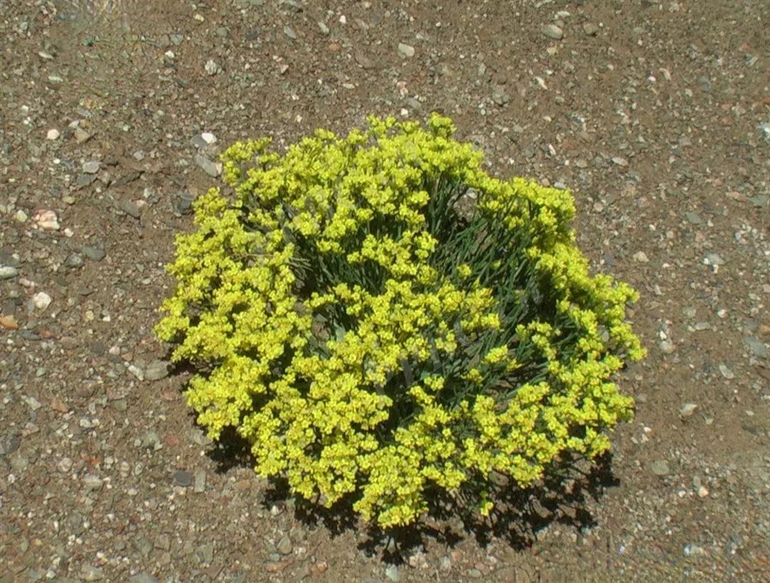 黃花補血草(Limonium aureum (L.) Hill)是白花丹科補血草屬多年生草本植物,柱高可達10-30cm,全株無毛。莖基往往被有殘存的葉柄和紅褐色芽鱗。葉基生,長圓狀匙形至倒披針形,先端圓或鈍,邊緣膜質(zhì)?;ㄐ驁A錐狀,花序軸綠色,穗狀花序位于上部分枝頂端,外苞寬卵形,萼筒基部偏斜,萼檐金黃色,裂片正三角形,花冠橙黃色。6-8月開花,7-8月結(jié)果。