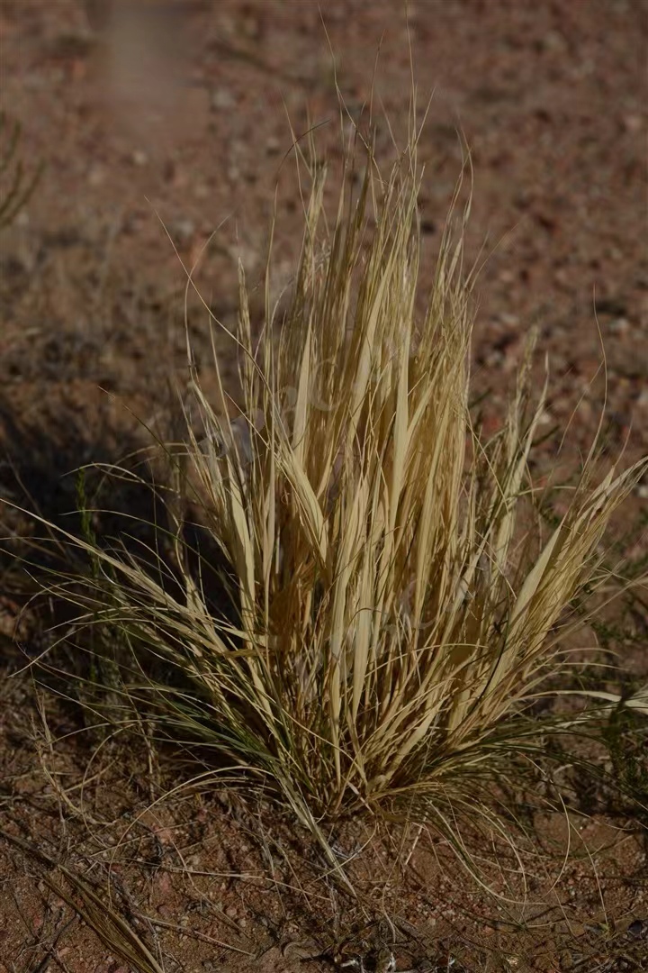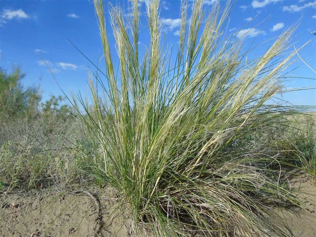 沙生針茅(Stipa caucasica subsp. glareosa (P. A. Smirnov) Tzve)禾本科針茅屬植物。須根較粗韌,外被沙套。沙生針茅葉鞘具短柔毛或粗糙,基生與稈生葉舌鈍圓,邊緣具纖毛;葉片縱卷如針,上面被短毛,下面密生剌毛,花背部具成縱行毛,密被柔毛;果穎尖披針形,先端細(xì)絲狀尾尖。花果期5-7月。
