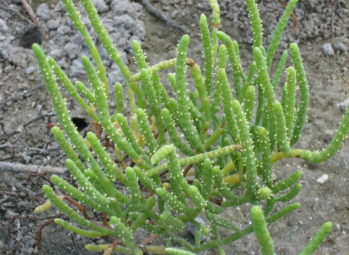 鹽角草(Salicornia europaea L.)是藜科鹽角草屬一年生草本植物,株高可達(dá)35厘米。莖直立,多分枝,枝肉質(zhì),葉不發(fā)育,鱗片狀,頂端銳尖,基部連合成鞘狀,邊緣膜質(zhì)。花序穗狀,腋生,花被肉質(zhì),圓錐狀,上部扁平成菱形;雄蕊伸出于花被之外;花藥矩圓形;子房卵形;鉆狀,果皮膜質(zhì);種子矩圓狀卵形,種皮近革質(zhì),6-8月開花結(jié)果。