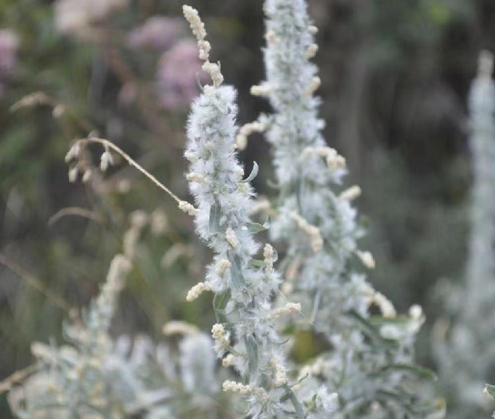 駝絨藜(Krascheninnikovia ceratoides (L.) Gueldenst.)是莧科駝絨藜屬多年生半灌木。株高可達(dá)1米,分枝斜展或平展,多集中于下部。葉條狀披針形,長(zhǎng) 1-5 厘米。雄花序較短,長(zhǎng) 4 厘米,緊密;雌花管橢圓形,長(zhǎng)3-4 毫米。果直立,橢圓形,被毛,花果期 6-9 月。